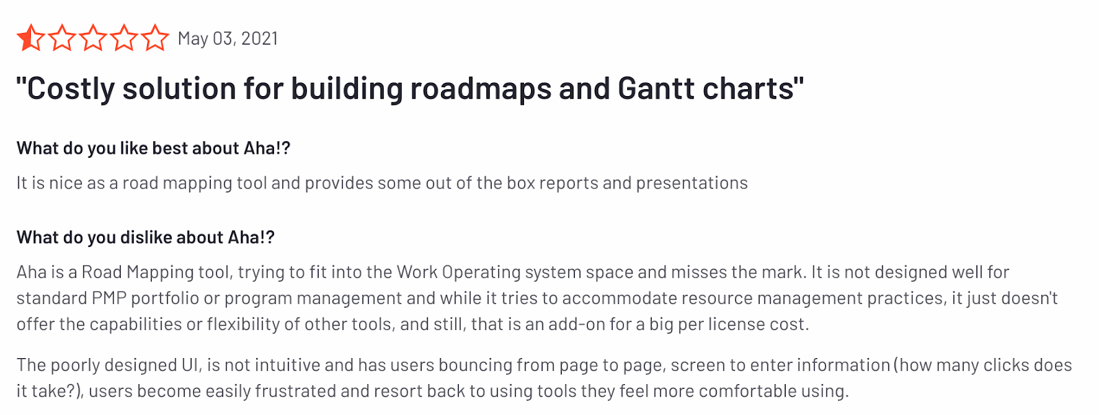 Aha! is a robust tool with lots of separate products. Aha! Ideas is focused on feedback, and Aha! Roadmaps are just for roadmaps. They offer additional tools to help you manage your products.