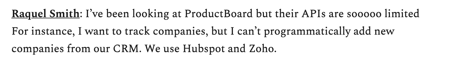 Users might find access to data restricted, which can be a hindrance when detailed insights are needed. The lack of a public API is one of the biggest risks of going with ProductBoard. Choosing a tool that âlocks inâ your data is inherently risky. You wonât be able to use the data you gather and input anywhere else. You can only access it within ProductBoard.
