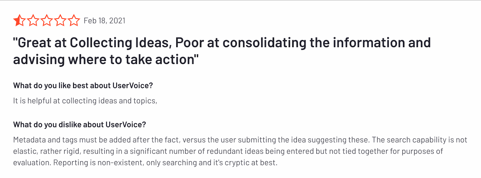 If you take on a new tool, youâre hoping it will save you time. In UserVoiceâs case, sometimes itâs not true. Some of the features seem underdeveloped, which results in some manual work.