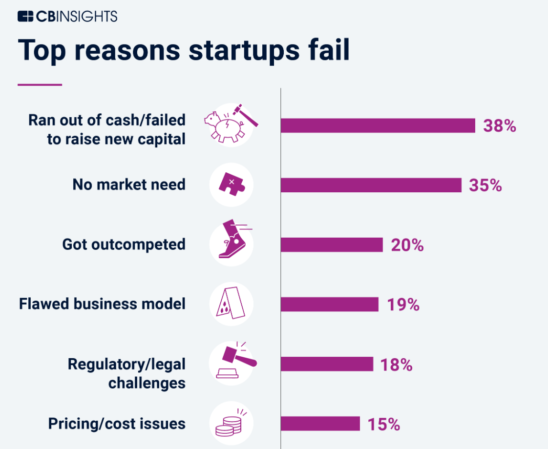 Itâs important to know how likely you are to succeed. CB Insights reports that 35% of startups fail because there is no market need.