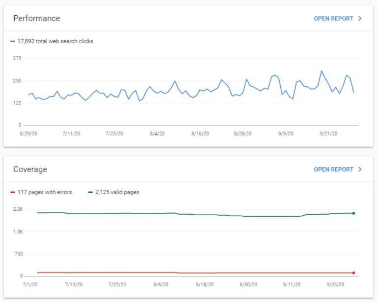 Google Search Console is a free tool you could also use. However, it’ll only give you a basic audit of your website. Here’s the Overview screen that shows the basic data, like the number of clicks or coverage.