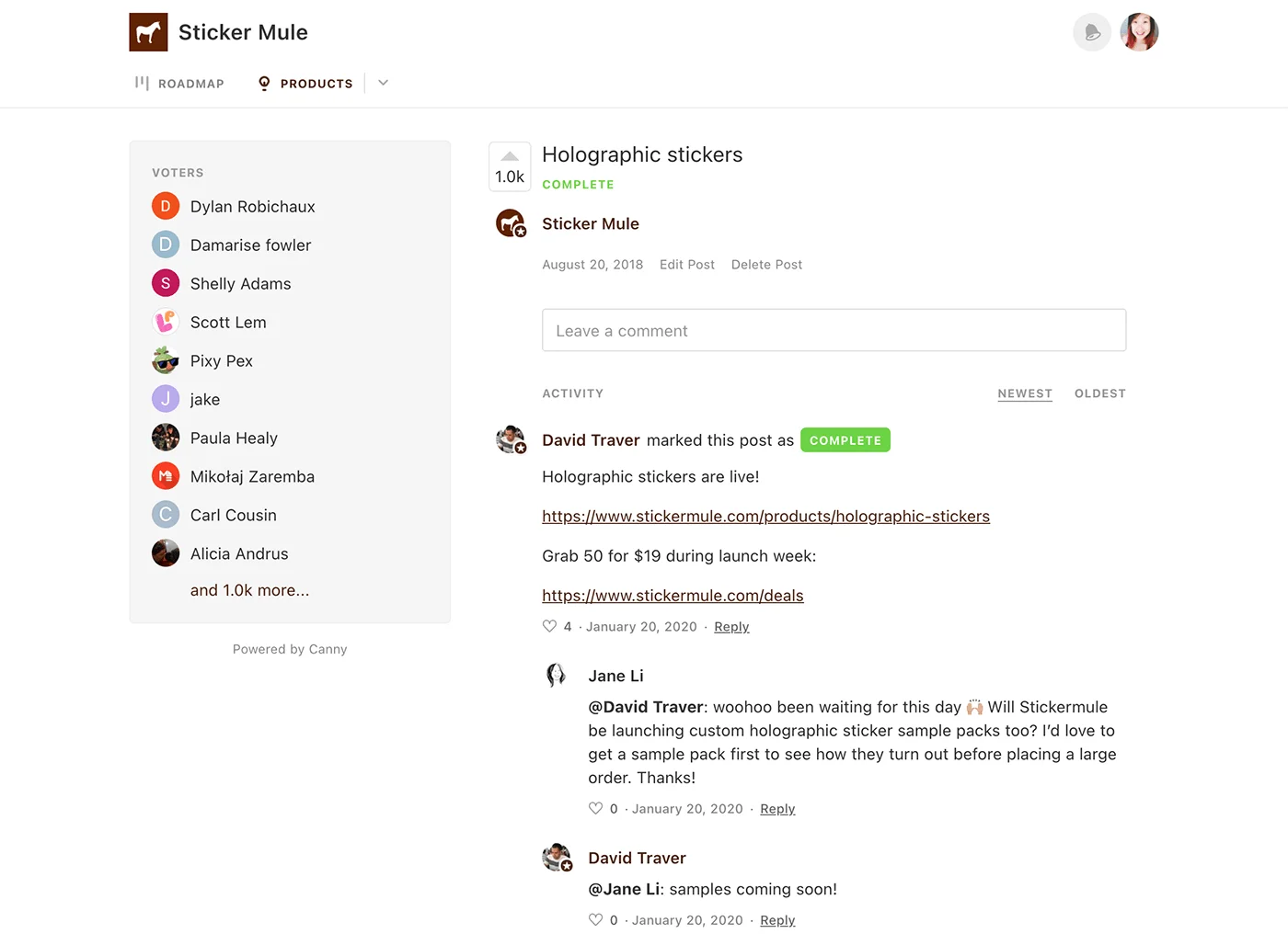 They had heard that people would like holographic stickers, but weren’t sure what the demand really was. When they posted the idea on Canny, it exploded.